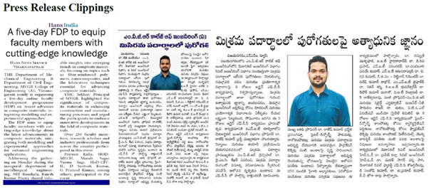 21- Nov – 2025, MVGRCE(A): The Departments of Mechanical and Civil Engineering, MVGR College of Engineering (Autonomous), Vizianagaram, organized a five-day online Faculty Development Programme (FDP) on “Recent Advances in Composite Materials: Integrating Modelling and Experimental Approaches” from 17th to 21st November 2025. The event witnessed enthusiastic participation from 487 faculty members across various engineering institutions in India.