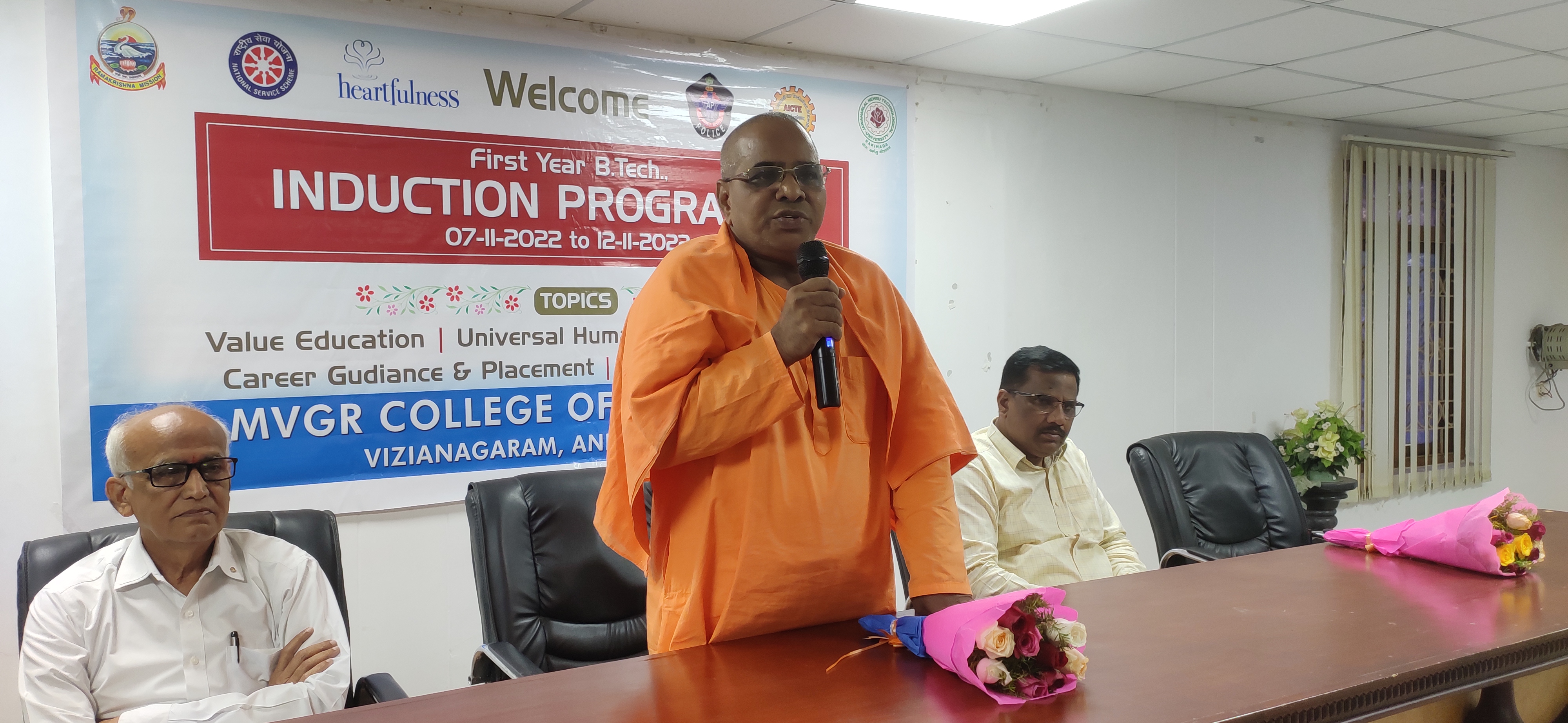 MVGR College of Engineering, Vizianagaram welcomed all B. Tech Freshers of the academic year 2022-23 on a high note. A week-long student induction program was planned for them starting from this Monday. For this, a motivational talk on Value Education - An inspirational Deliverance was conducted for all first-year students. Swami Swasamvedyananda Maharaj, Secretary, Rama Krishna Mission, Visakhapatnam; Sri D.V.S.Raju, Founder, Minerva Educational Institutions, Visakapatnam were the resource persons for the programme. Speaking on the occasion, Mr. S. Mohan Kumar, Dean of Students, said that the students need to make use of the opportunities provided to harness the power of human intellect.